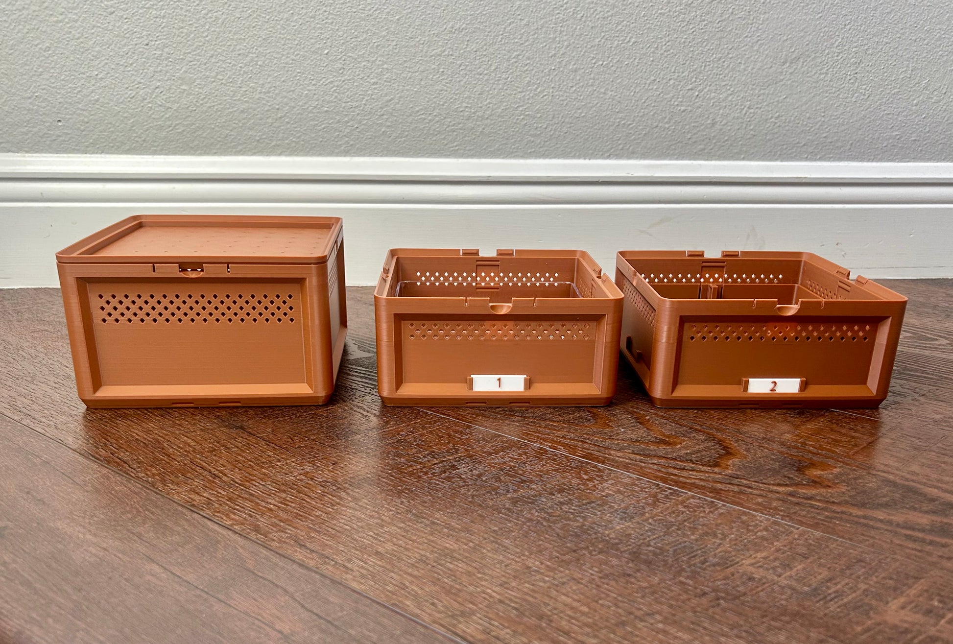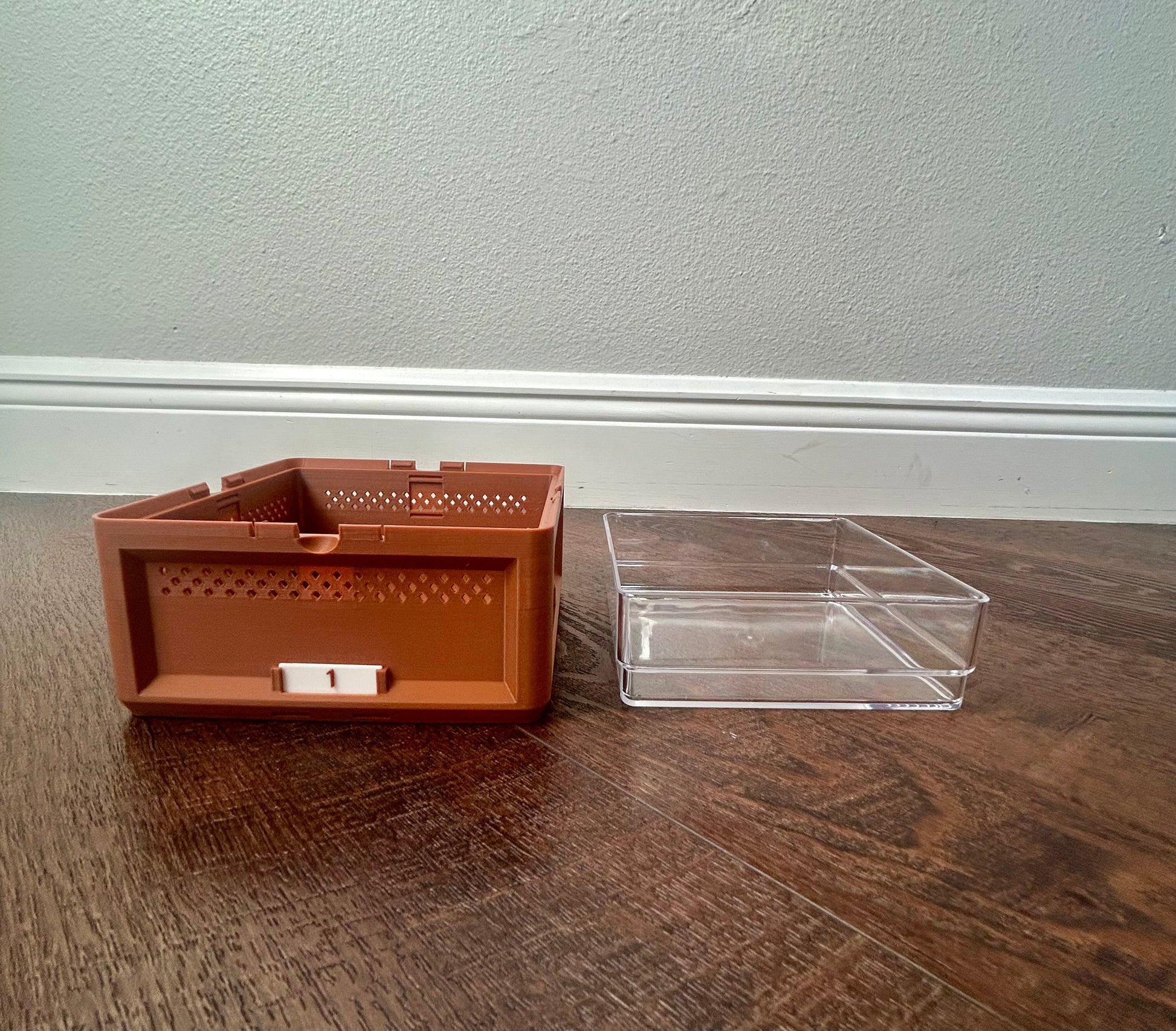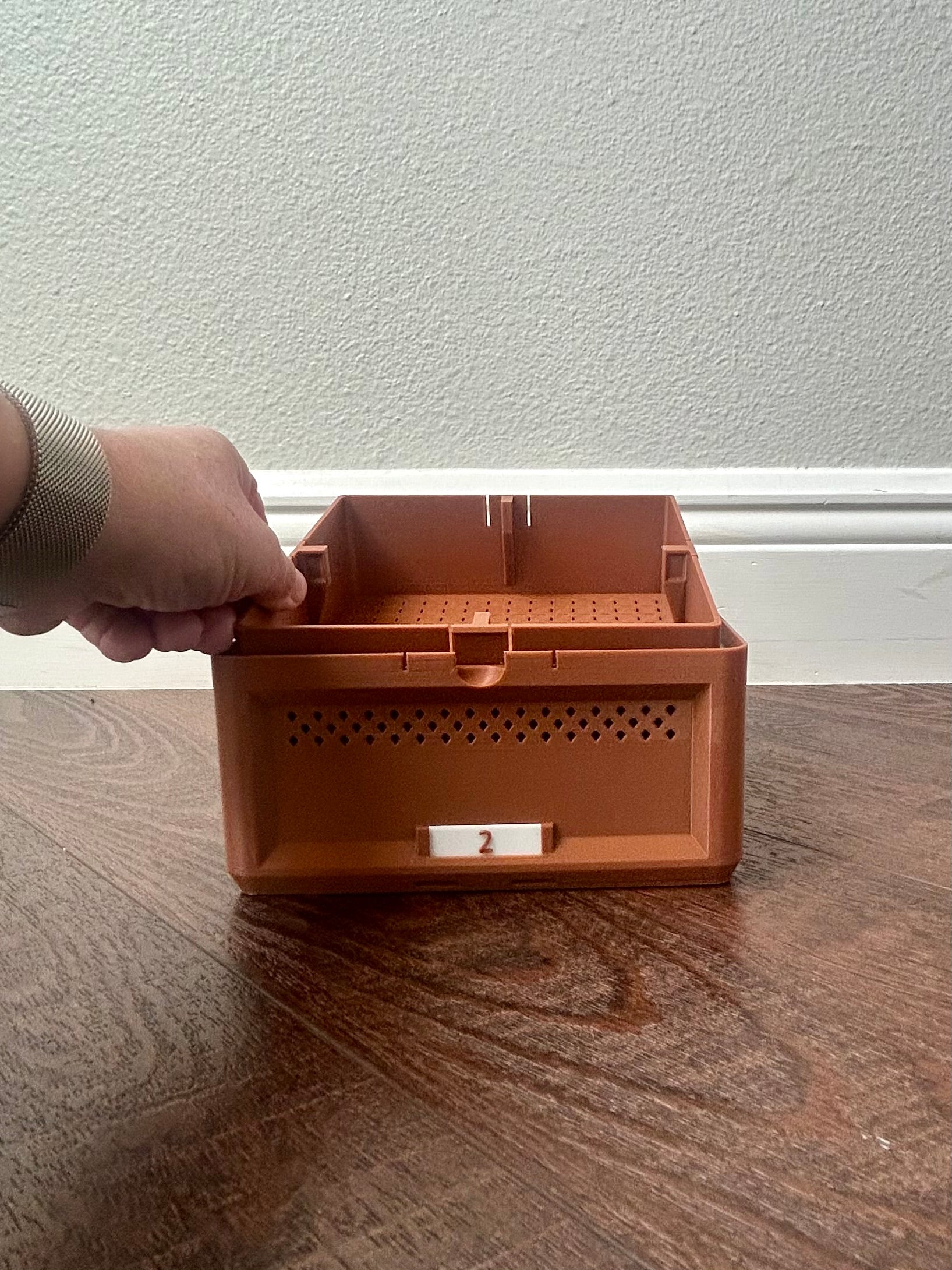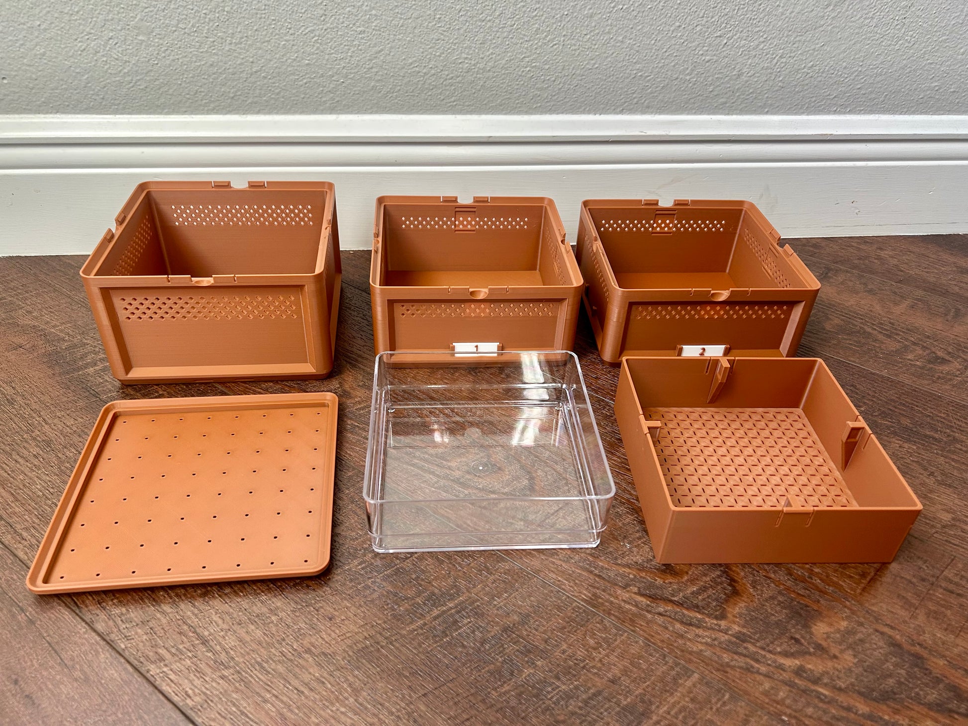 • Multi-Chamber Stackable Design – Includes a top beetle tray with a ventilated, perforated floor for eggs, hatched worms and frass drop-through, and a lower tray for worm collection.